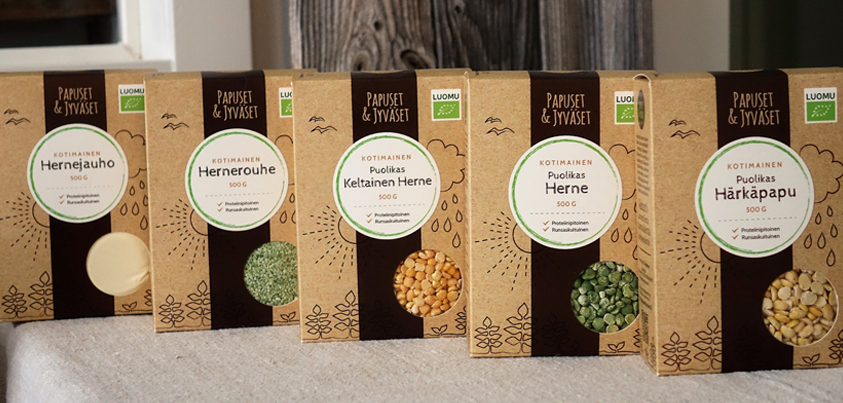 Papuset ja Jyväset -tuotteissa käytetyt herneet ja härkäpavut viljellään esisijaisesti omalla tilalla. Kuivatut herneet ja härkäpavut lajittelemme ja kuorimme. Kuorinnan jälkeen osa tuotteista jauhetaan oman tilan kivimyllyllä karkeudeltaan halutunlaiseksi rouheeksi tai hienoksi jauhoksi.